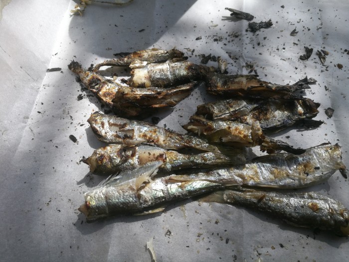 Pidimmekin tunnin mittaisen tauon, osa silakoista kypsennettiin halsterilla ja makkara sekä muut eväät maistuivat puolilta päivin. Pirjo hämmästeli toimiamme ja harmitteli ettei ollut aikaisemmin päässyt mukaan. Hiillostetut tuoreet hailit olivat tosi maukkaita ja menivät kaupaksi alta aikayksikön joten osa makkaroista jäi syömättä.